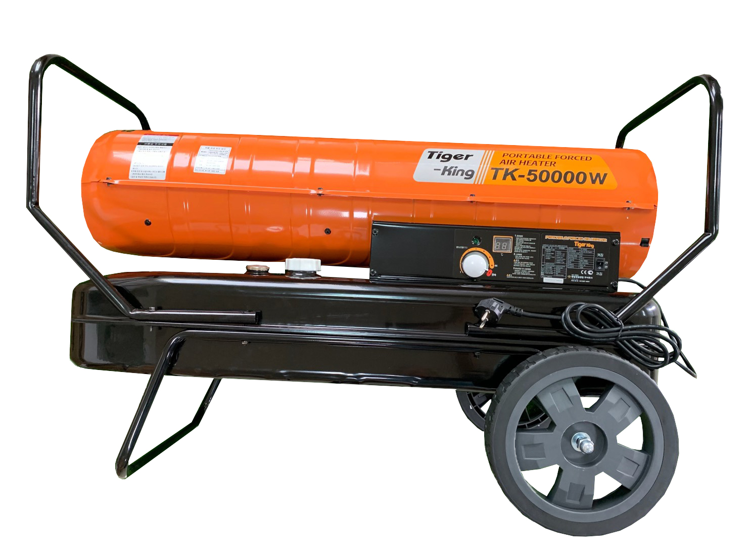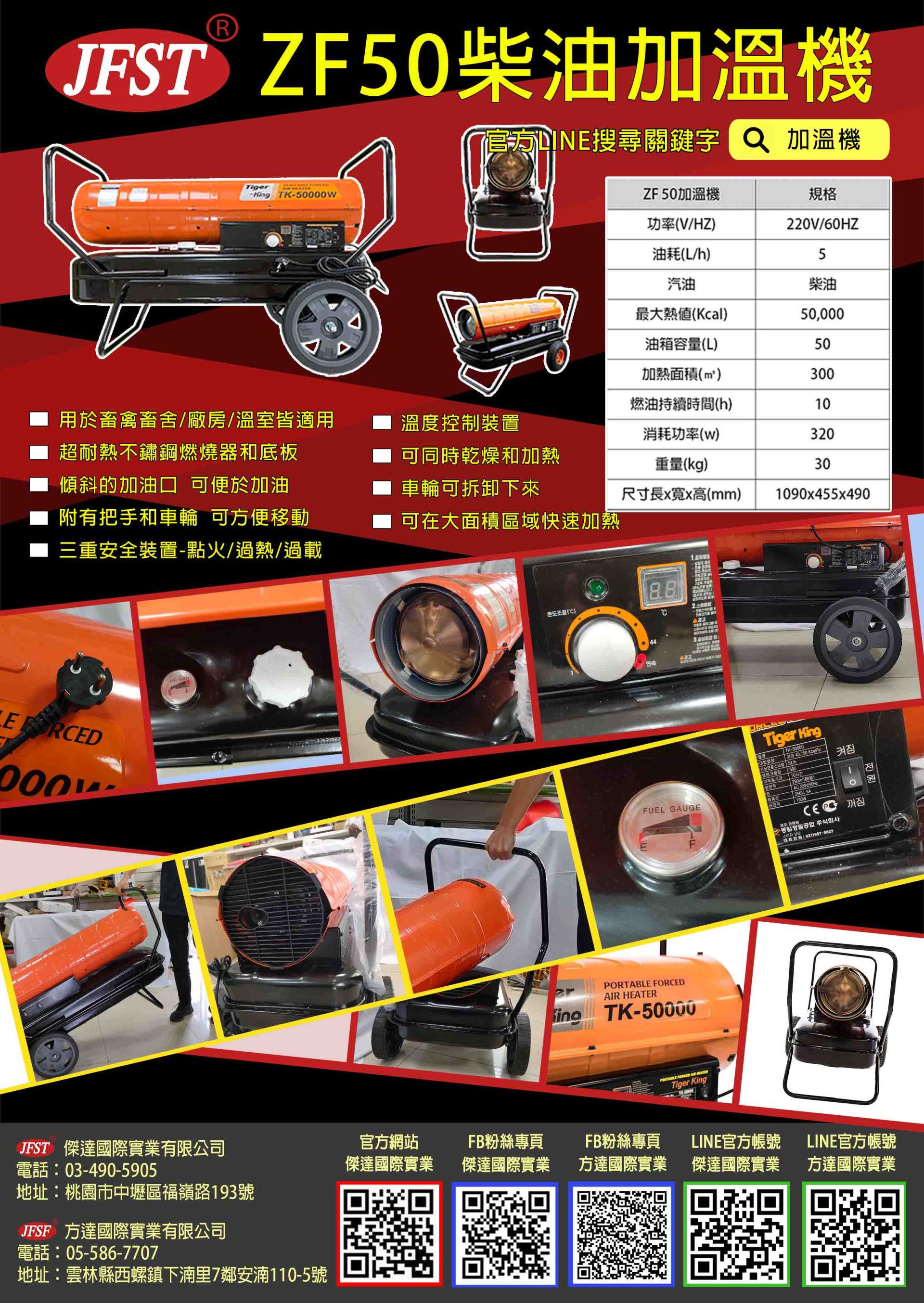 溫度控制裝置、三重安全裝置、高度控制裝置 使用超耐熱不銹鋼板、可移動式風輪/ 採用所需的溫度控制裝置檢測外部溫度/ 點火/過熱/過載安全裝置/ 適用於花房、工廠、動物畜舍、體育館、 室外場地/產品規格/ 型號: tk-50000/ 功率(v/hz): 220v/60hz/ 油耗(l/h):5/ 最大熟值(kcal): 50,000/ 油箱容量(l): 50/ 加熱面積(m): 300/ 燃油持續時間(h): 10/ 消耗功率(w): 320/ 重量(kg): 30/ 尺寸(長寬x高)(四) 1090x455x490/