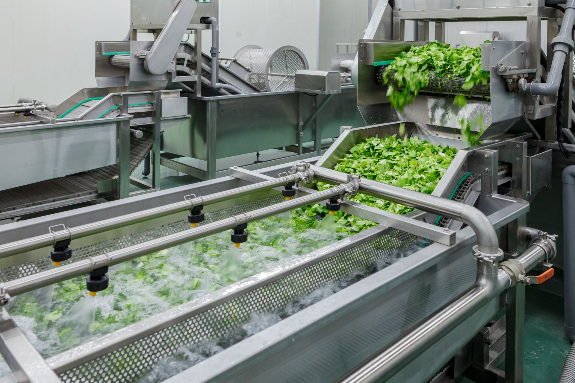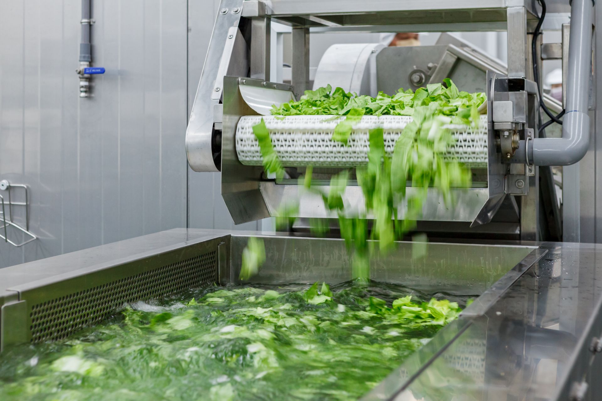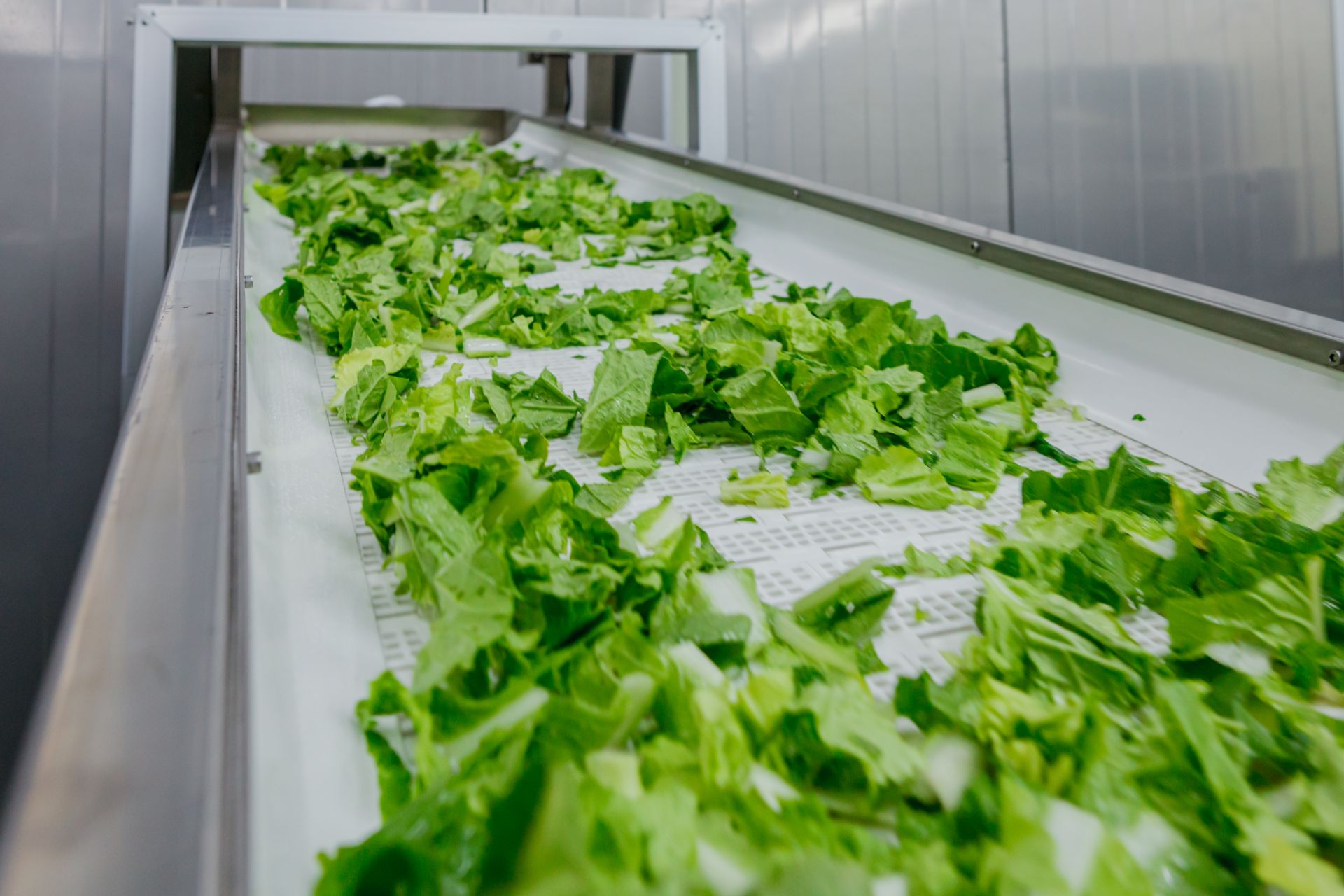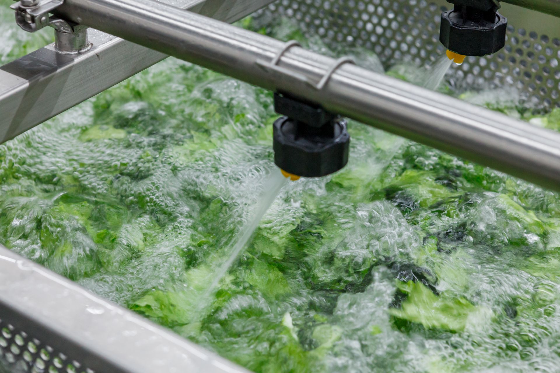 我們的截切葉菜類的生產線每條都設有三大水槽,第一槽兩側雙漩渦洗滌,充分打散菜葉並使雜質分離;第二槽使用高壓氣曝將葉菜表面的髒污分離,漂浮的蟲體會由過濾輥筒濾出;第三槽使用5~7度c的冰水沖洗,將葉菜降至保鮮最佳的溫度,最後再由人眼挑揀是否還有異物殘留,一切備妥後才秤重打冰包裝,出貨至客戶手中。