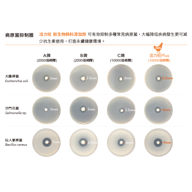 有效抑制大腸桿菌、沙門氏菌、李斯特菌、仙人掌桿菌孳生,大幅降低細菌性疾病發生,減少飼糧抗生素用量