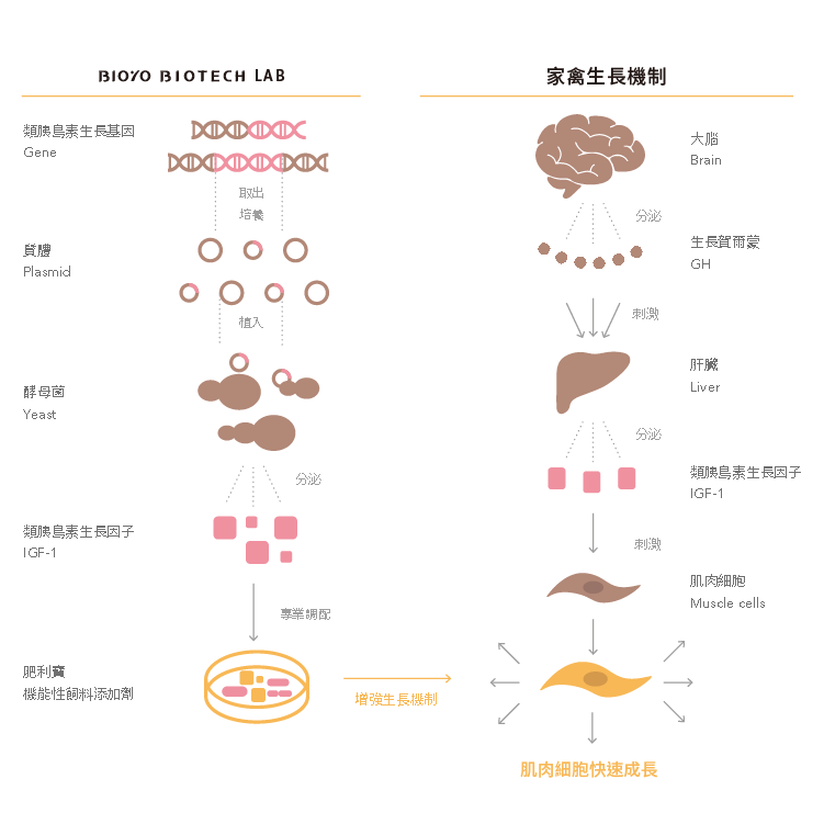 富含高單位特殊促生胜肽(類胰島素生長因子),經由腸胃道吸收後,可增強生長機制,加速肌肉快速合成,縮短養殖天數