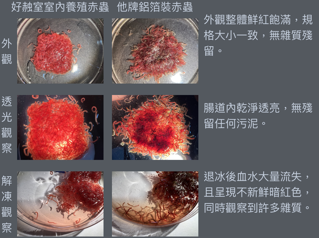 新鮮:我們的赤蟲在台灣本地養殖、生產,實現一條龍式的養殖、採收、包裝和冷凍過程,無需經過長途國際運輸,確保赤蟲最新鮮。