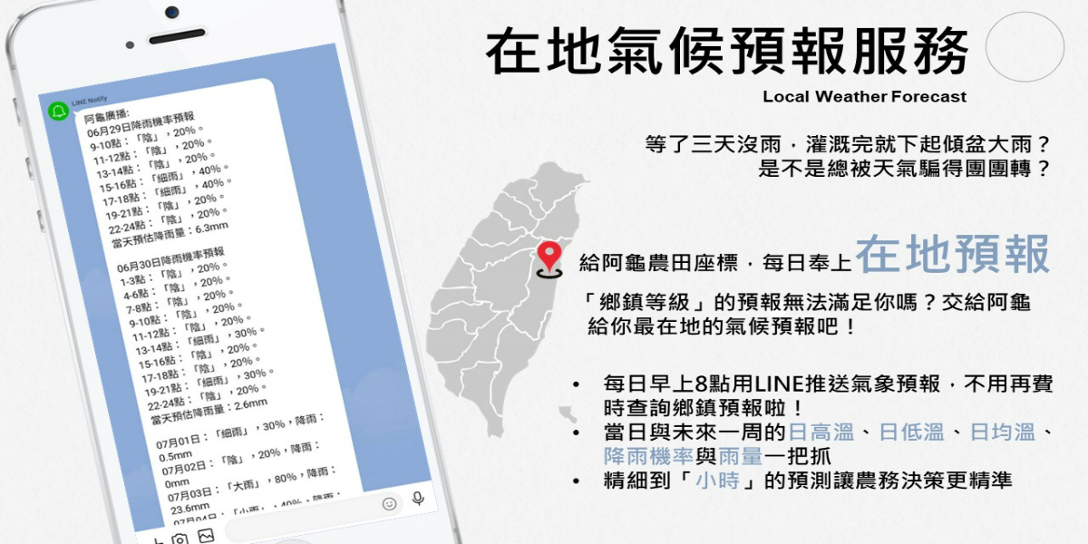 in addition to real-time environmental data, agriweather partners with the largest climate services company in taiwan to offer localized climate forecasting services. users can join a dedicated line group to select forecast items and receive daily weather forecasts for their specified location for the upcoming week.