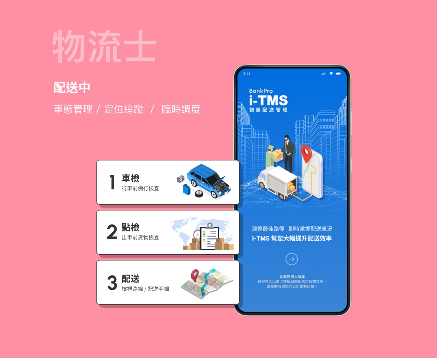 i-tms智慧配送管理,為第三方物流、品牌車隊打造快速導入的運輸管理模組。 調度士可輕鬆管理的視覺化派車界面,透過路線路順智慧演算,跨系統整合多渠道訂單資料,有效解決(1) 紙本作業的混亂流程 (2)派車僅憑調度士的經驗。 而為物流士打造的專屬app,清晰顯示每日配送資訊與路線,並加入車檢、點檢功能輔助,協助物流士在安全健康的環境中,無誤地展開每一日的工作!