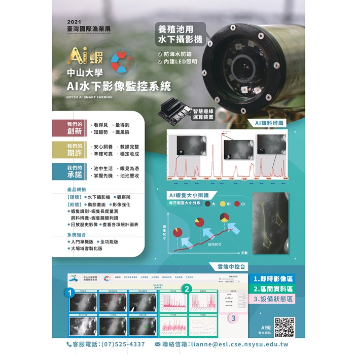 中山大學智慧養殖管理系統是整合電子資訊科技與水產養殖技術,利用水下攝影裝置等物聯網系統,以此進行全天候監控收集池中蝦隻動態影像。將傳回的影像進行影像強化,克服不同的光線、水色及混濁度,以人工智慧技術自動辨識餌料殘量、蝦子大小/數量/活動力/攝食情況,進而智慧控制餵食量與改善水質。
