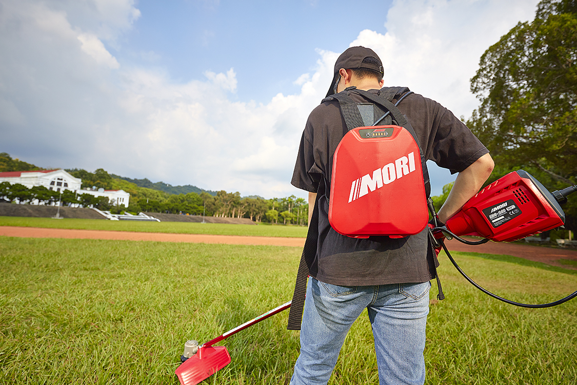 mori ebc-2401 shoulder type brush cutter is using high output brushless 450w motor, your best choice for your landscaping your garden. this grass cutter can be powered either by 36v 25.2ah or 36v 6.3ah dc battery, providing different operation time. led warning indicator is used to inform users when current or temperature are overload to protect the battery and the motor. there is also reverse spinning switch for easy removal of grass clipping. 3 minutes time out function is perfect for forgetful users to prevent unnecessary electricity run off.